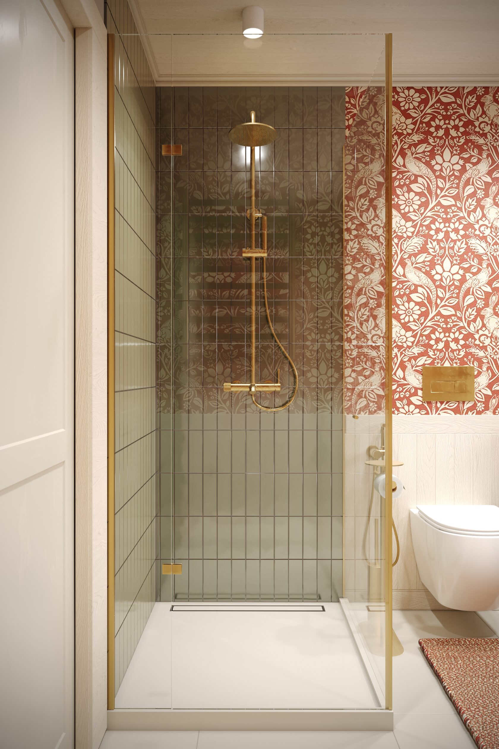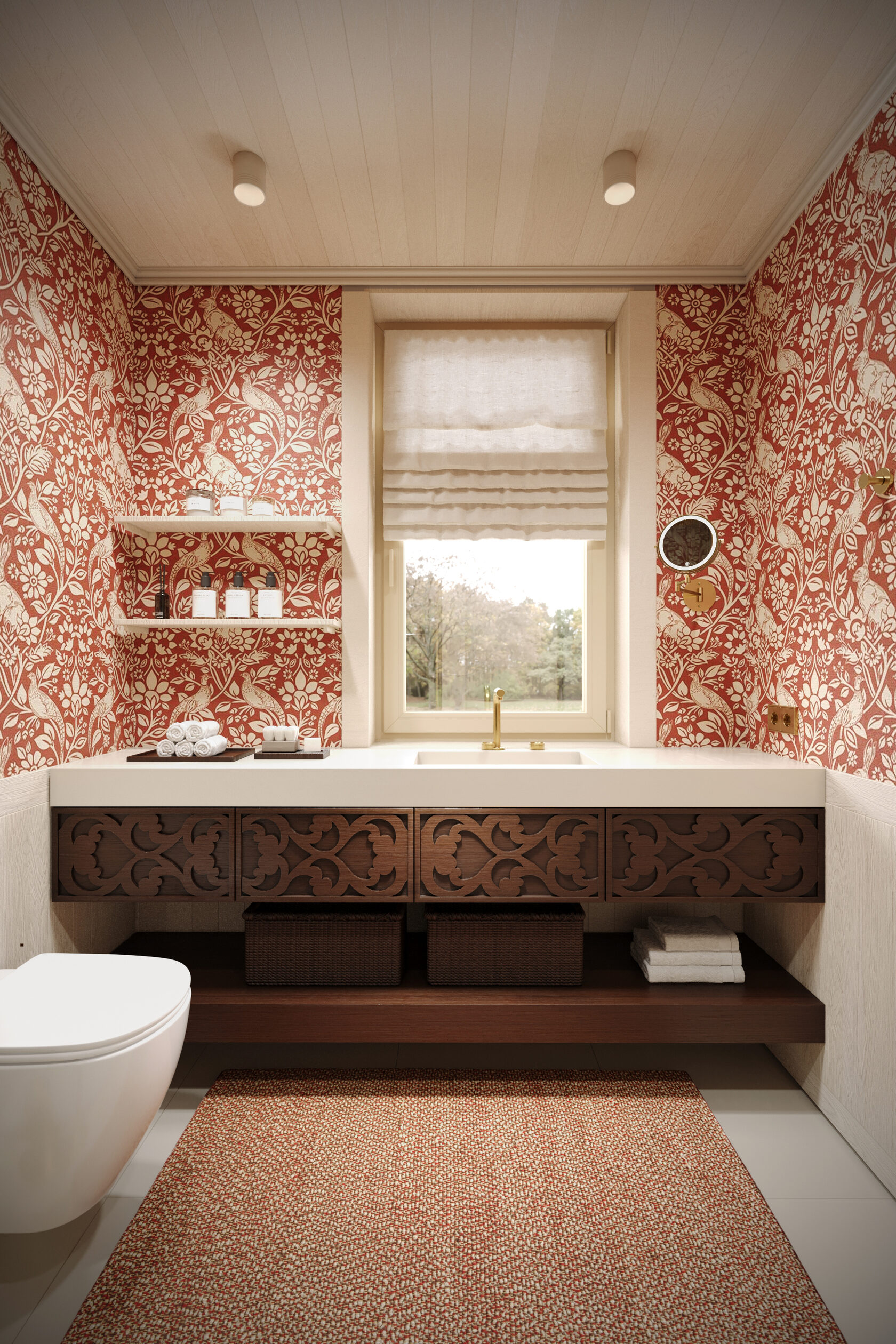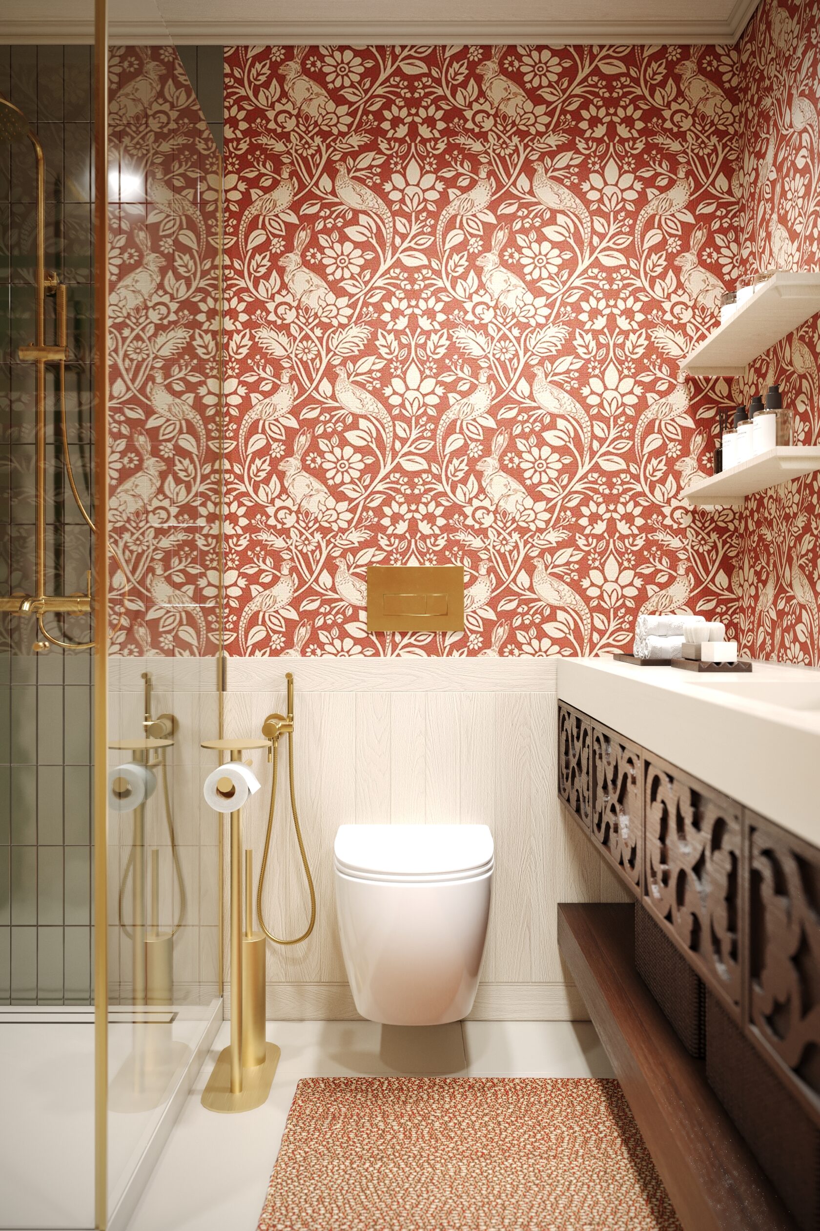 В ванной комнате, оформленной в тёплых тонах с народными мотивами, резные фасады, латунные детали и обои с птицами подчёркивают изящество и гармонию интерьера.