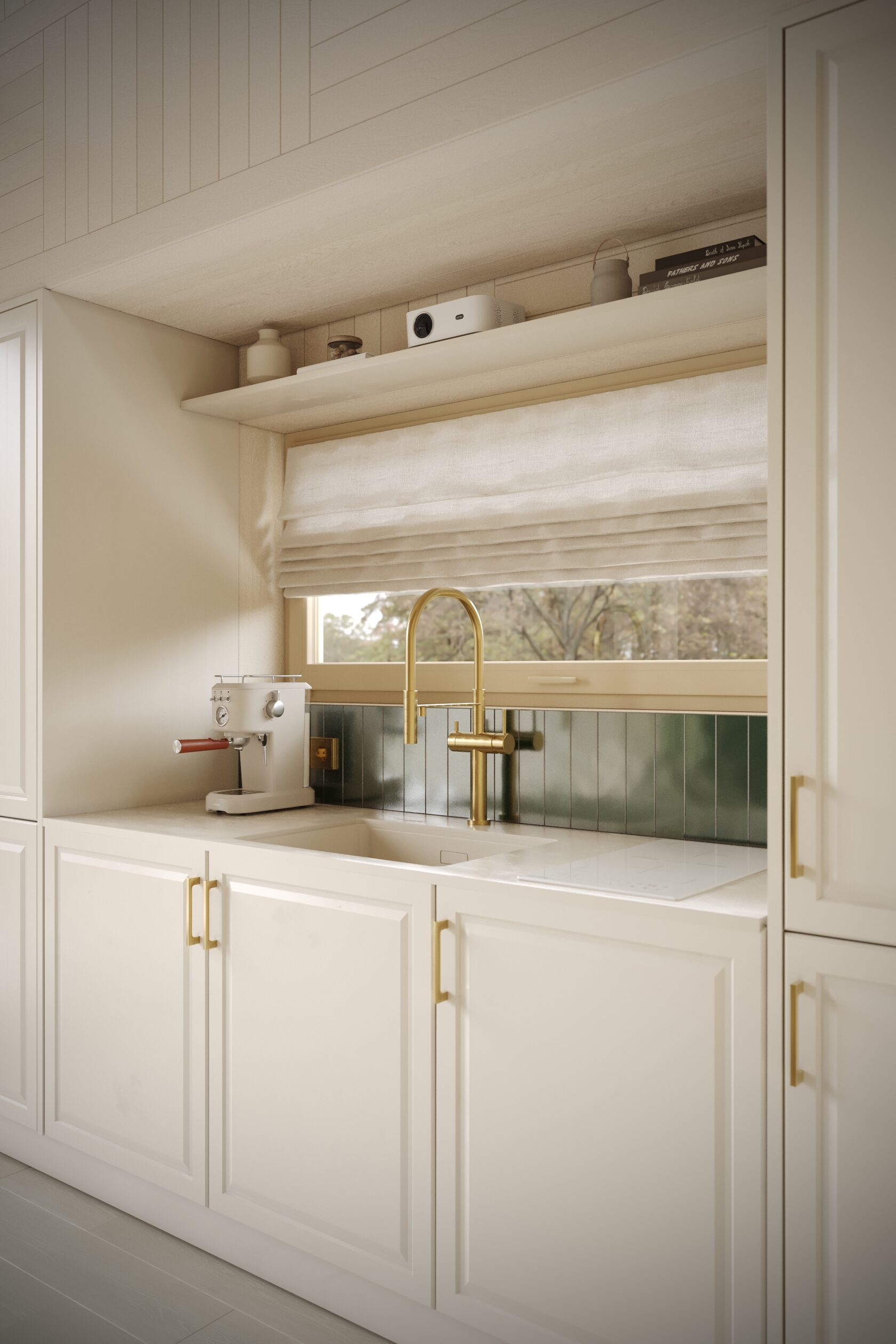 Светлые деревянные панели и орнаментальные детали гармонично сочетаются с цветочными обоями и текстилем, создавая утончённый комфорт, а встроенные лестницы и эргономичная кухня обеспечивают практичность и эстетику.