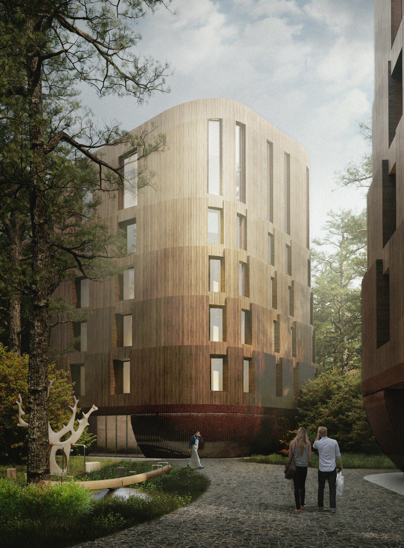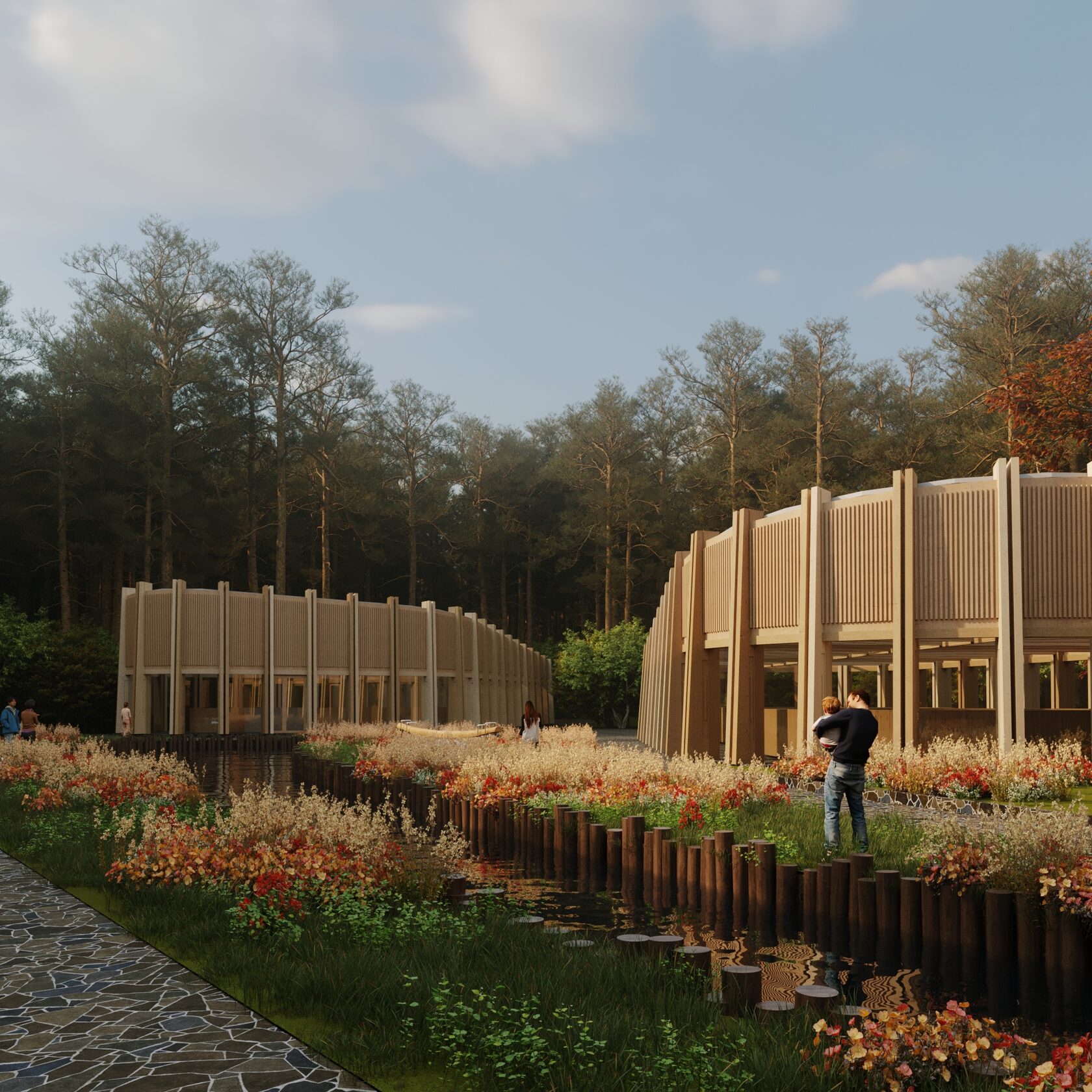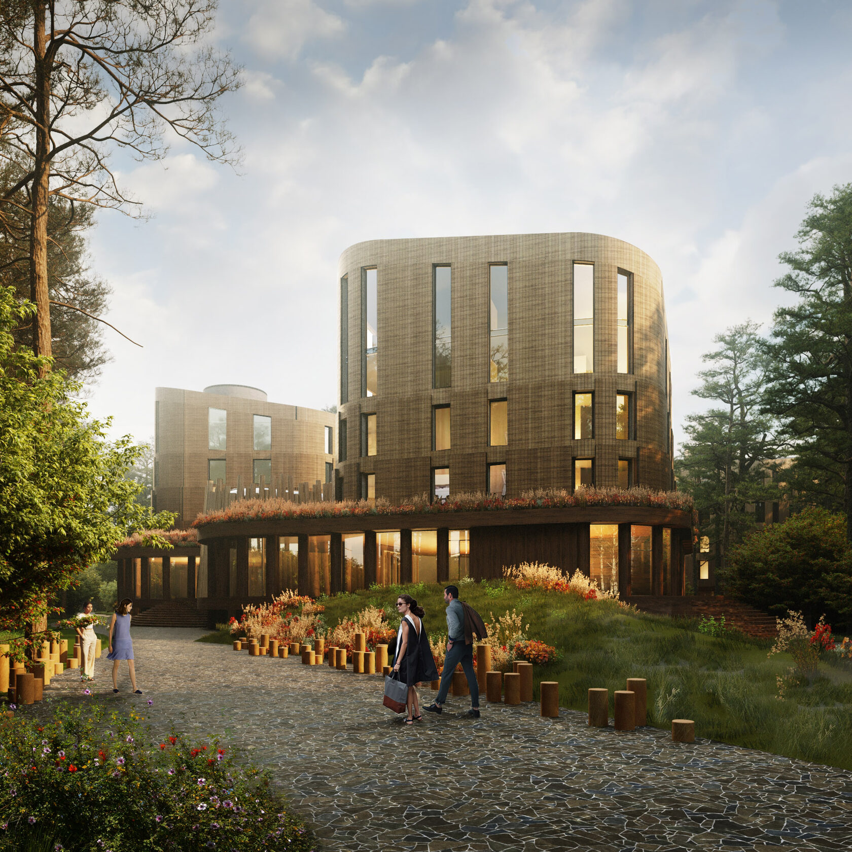 Аквапарк выполнен в органичном стиле с изогнутыми формами, плавной кровлей и панорамными окнами.