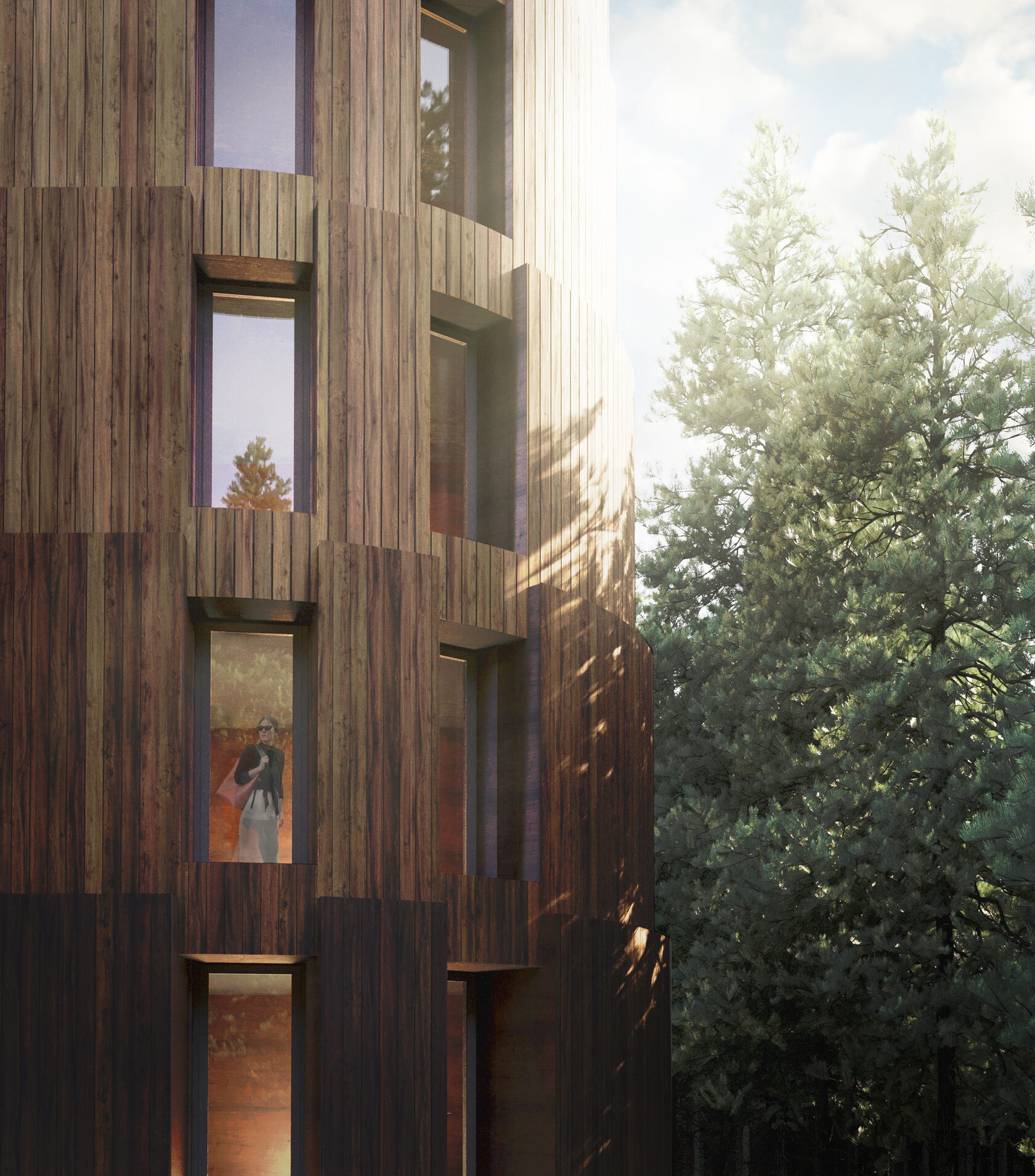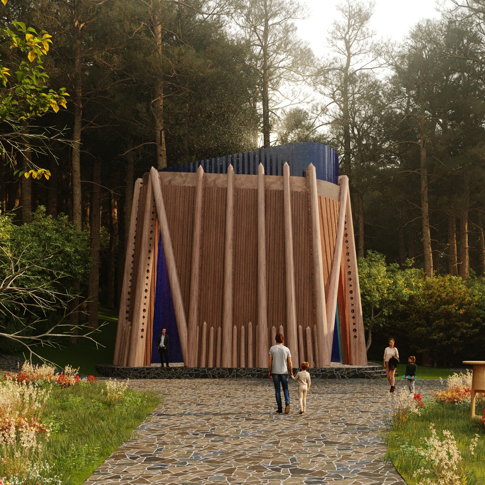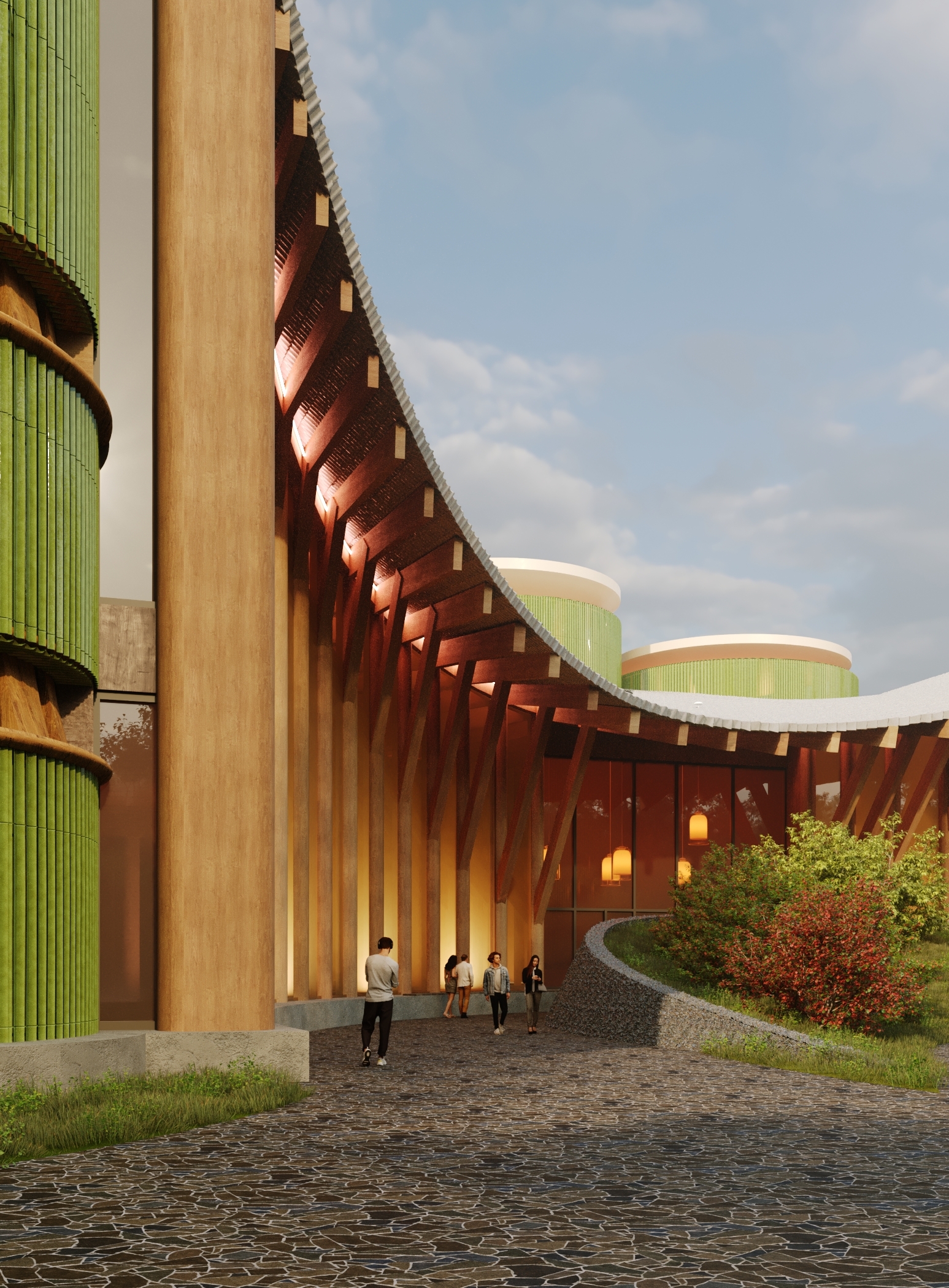Аквапарк выполнен в органичном стиле с изогнутыми формами, плавной кровлей и панорамными окнами.