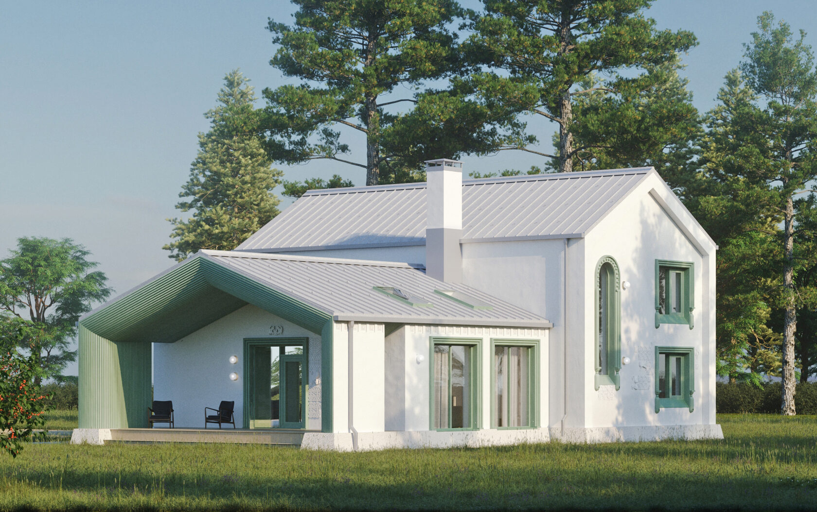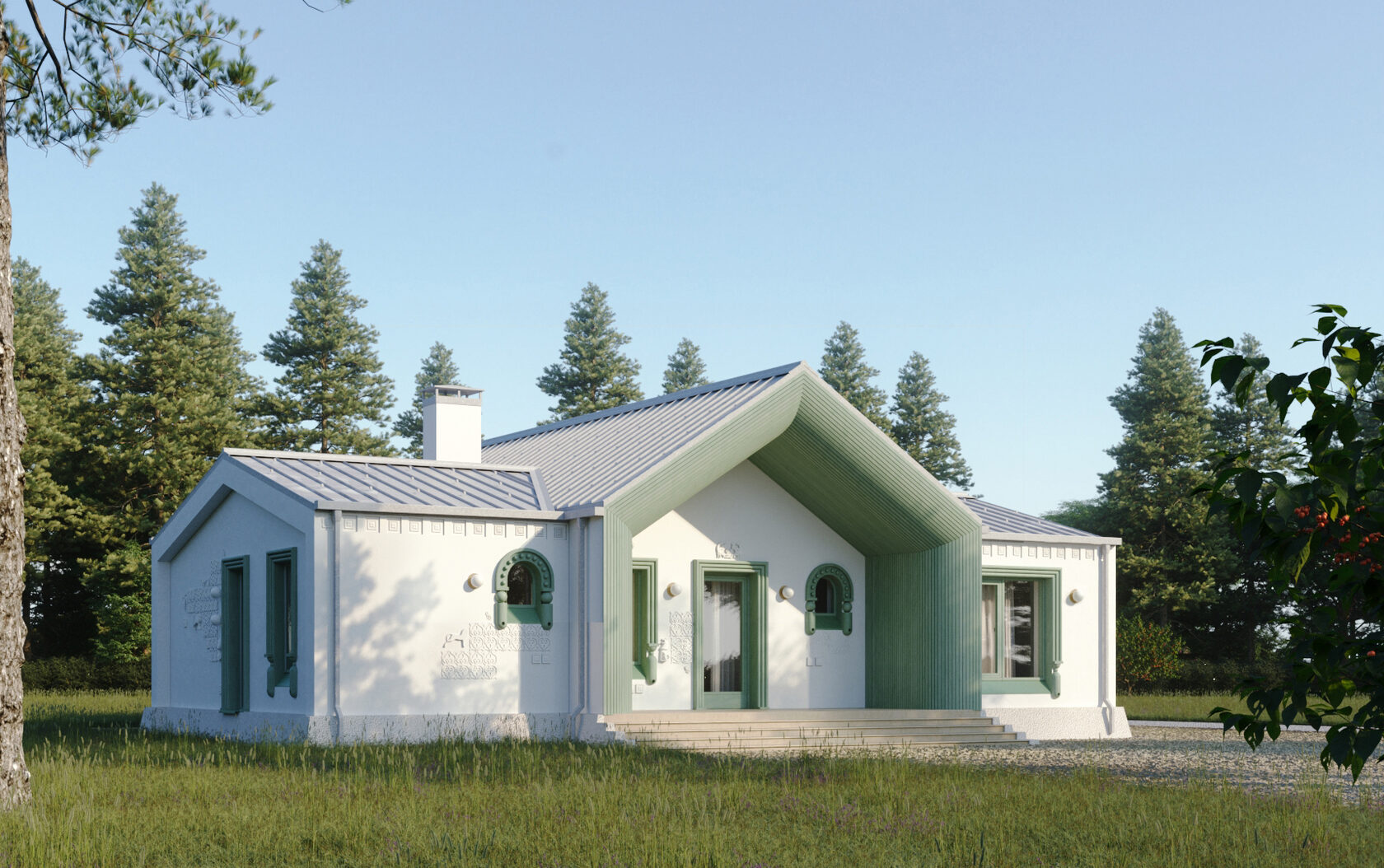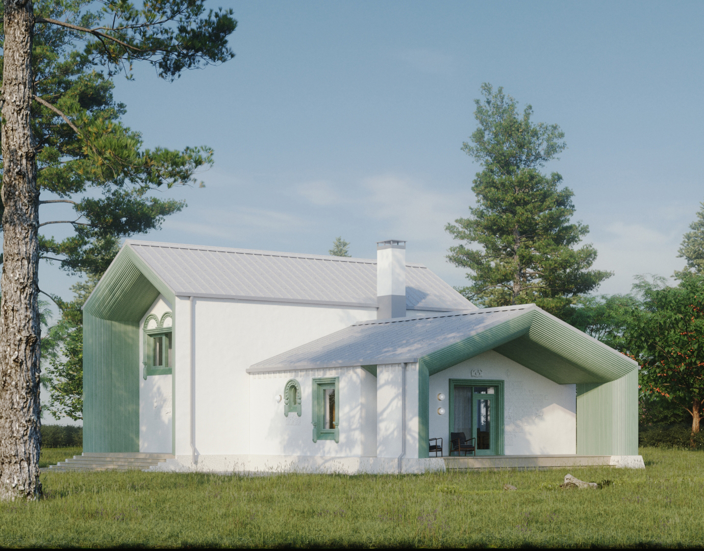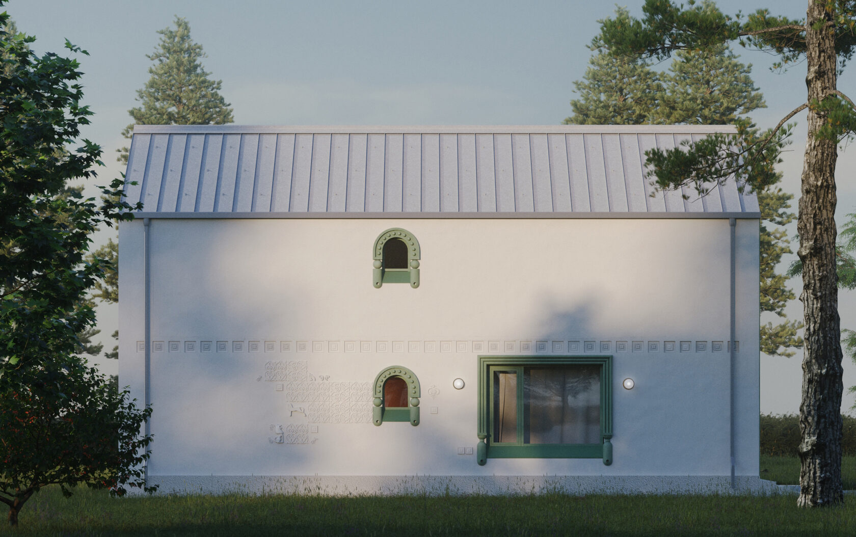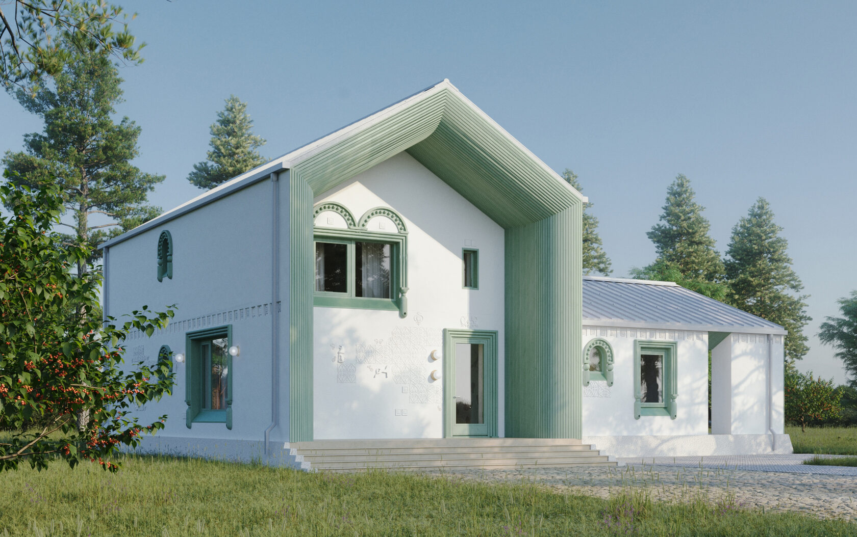 Архитектура этих домов вдохновлена традициями белокаменного зодчества, переосмысленными в современном ключе. Мягкие, припухлые формы и бочкообразные линии создают уютное, почти сказочное впечатление. Окна расположены в свободном, живом ритме, а декоративные наличники напоминают кокошники, придавая фасадам изящную декоративность.