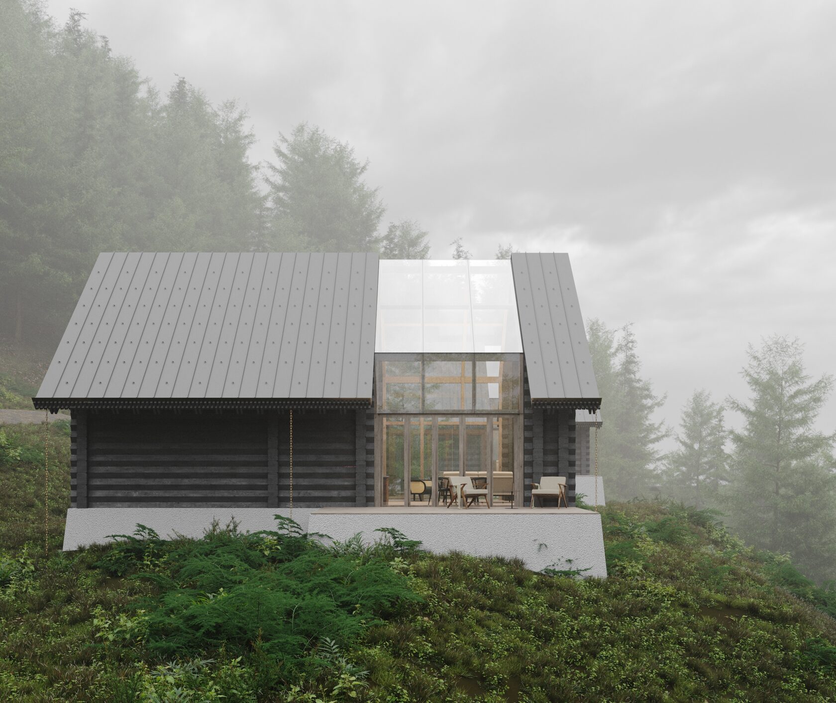 Глубокий чёрный фасад подчёркивает выразительность окон с геометрическим декором, а большая стеклянная инкрустация впускает в дом лесной свет и простор, создавая эффект присутствия в самой природе.