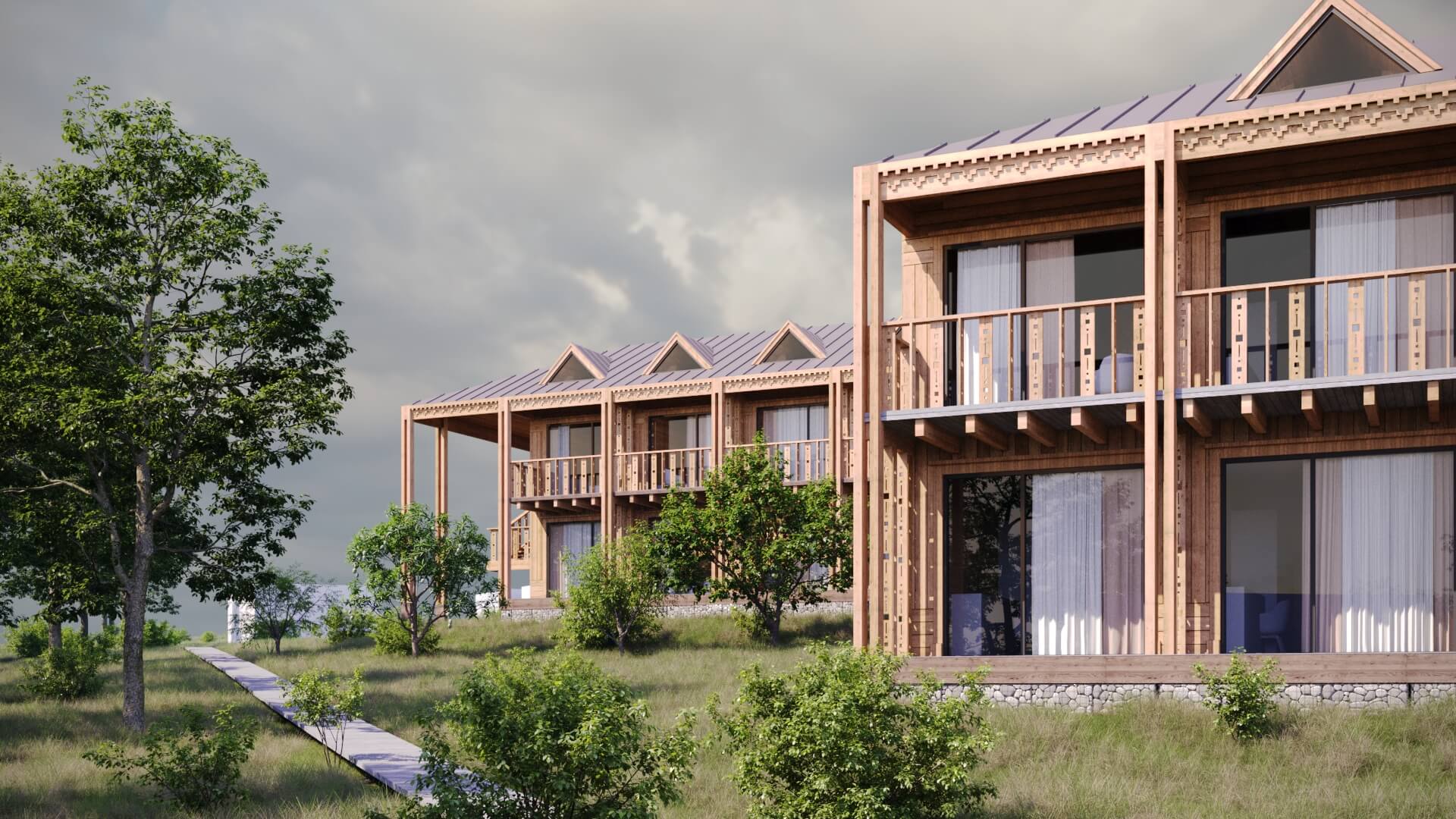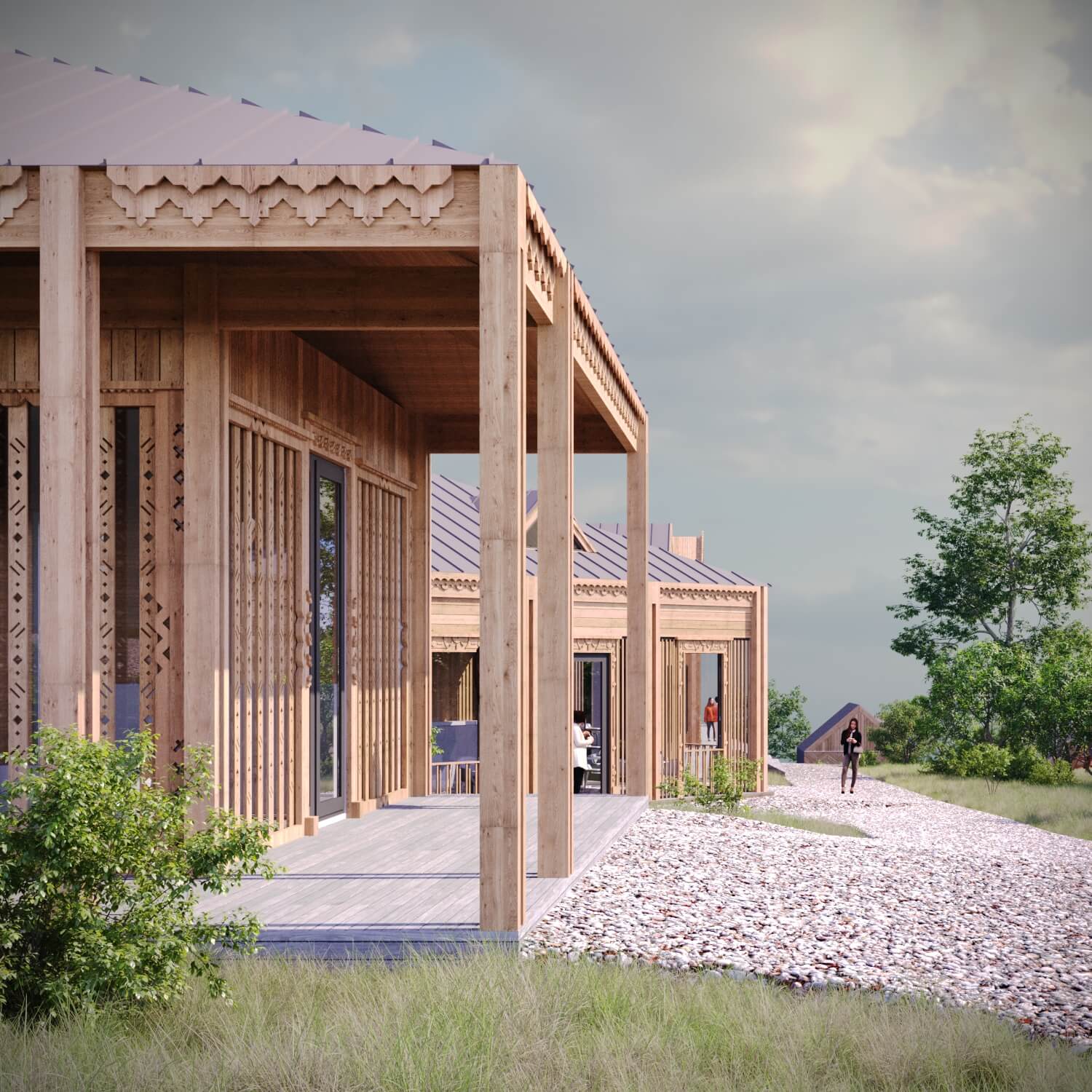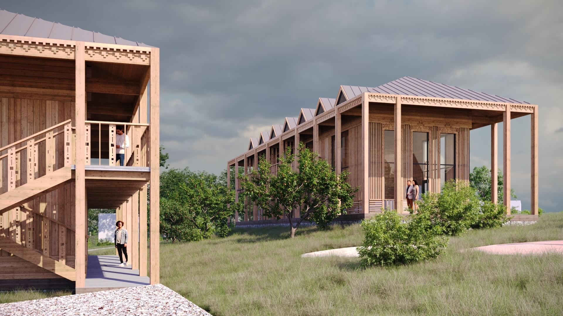 Здесь хочется молчать, смотреть на утренний туман и наслаждаться каждым мгновением природы. Архитектура комплекса основана на лаконичных формах, природной палитре и тонкой резьбе, отсылающей к традициям русского зодчества.