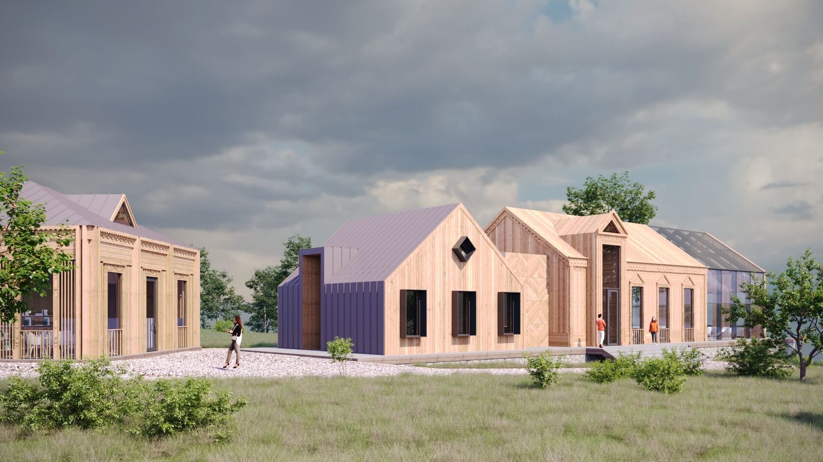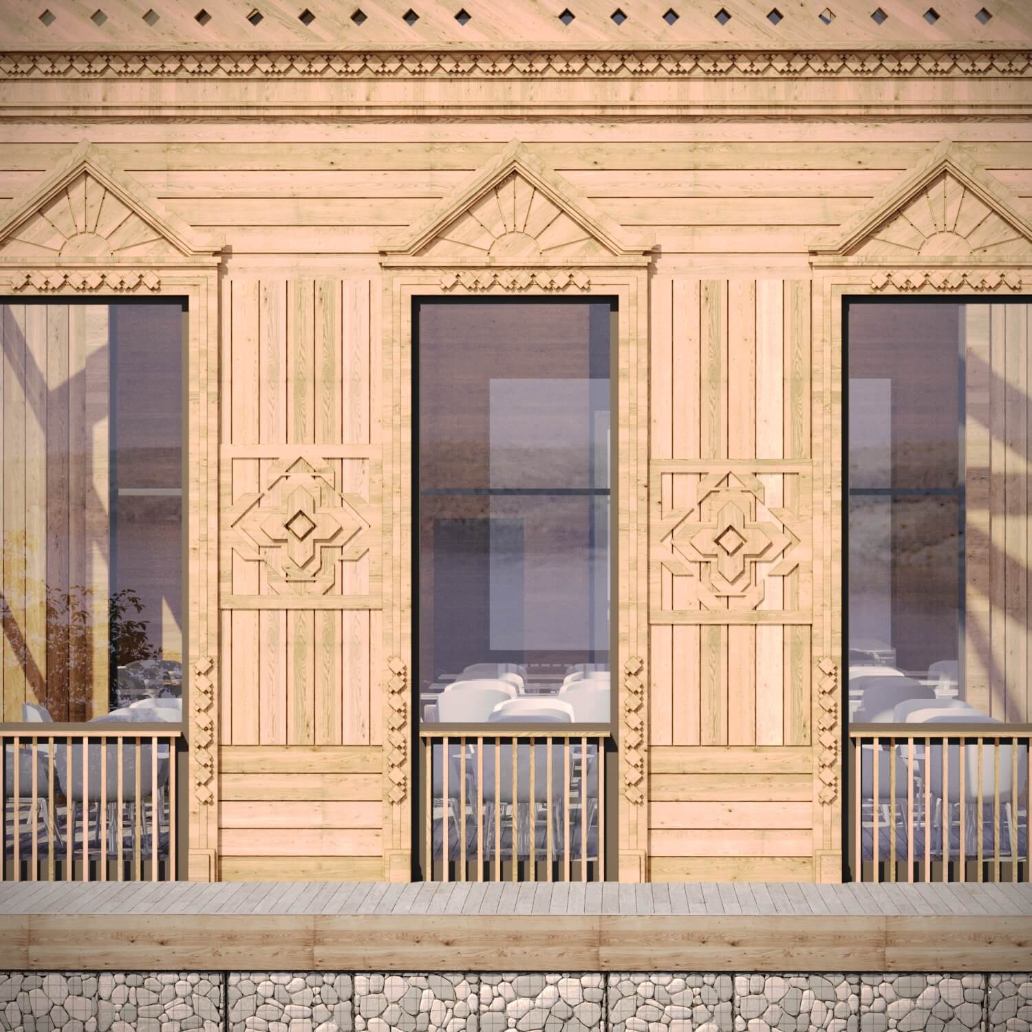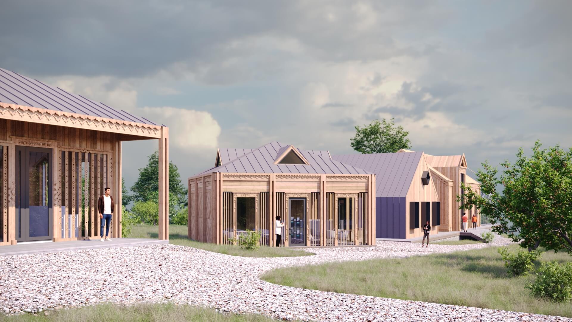 Здесь хочется молчать, смотреть на утренний туман и наслаждаться каждым мгновением природы. Архитектура комплекса основана на лаконичных формах, природной палитре и тонкой резьбе, отсылающей к традициям русского зодчества.