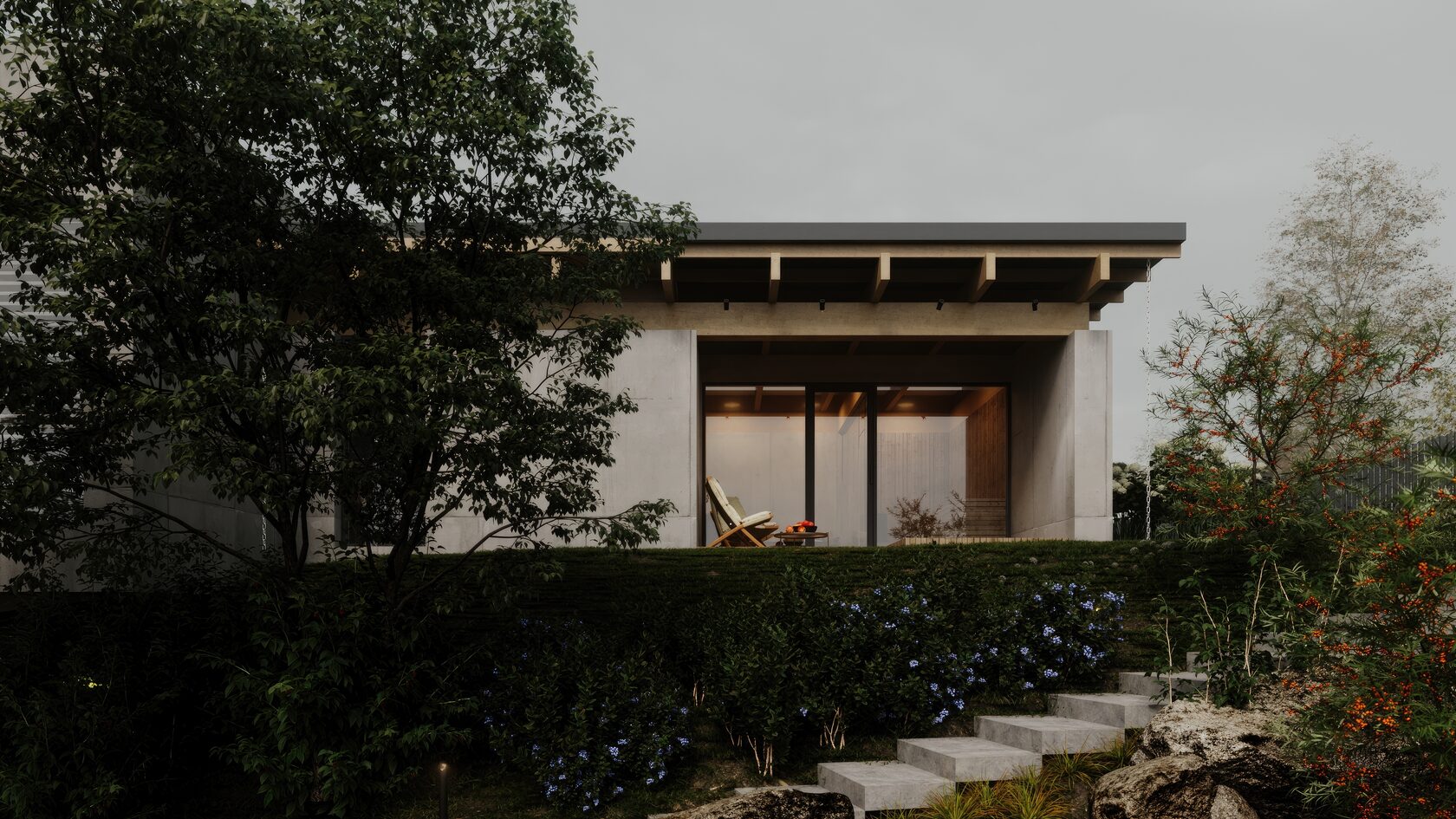 Монолитный дом из трехслойного бетона расположен на крутом склоне у озера. Баланс строгих линий, текстур и природных акцентов.