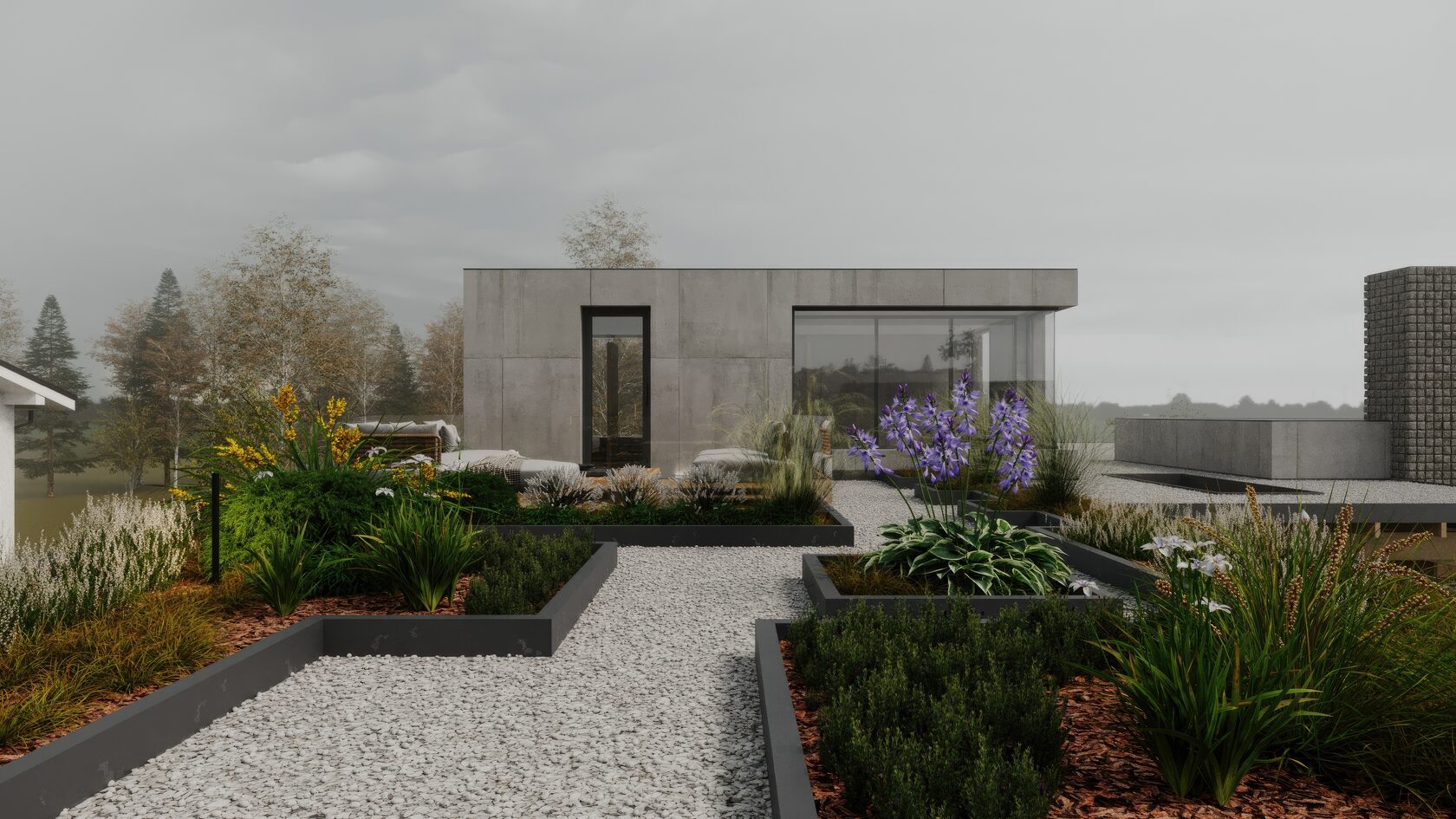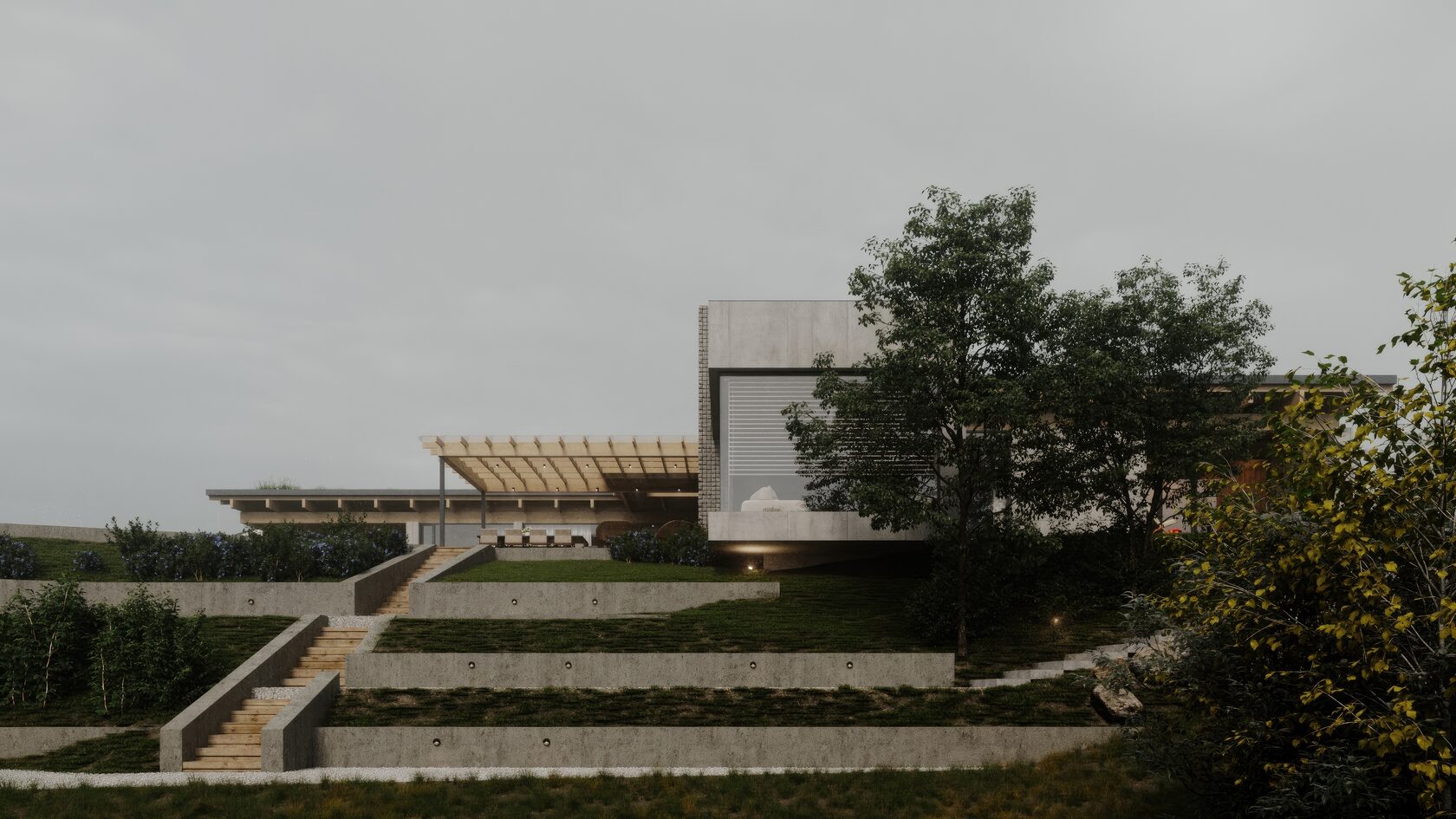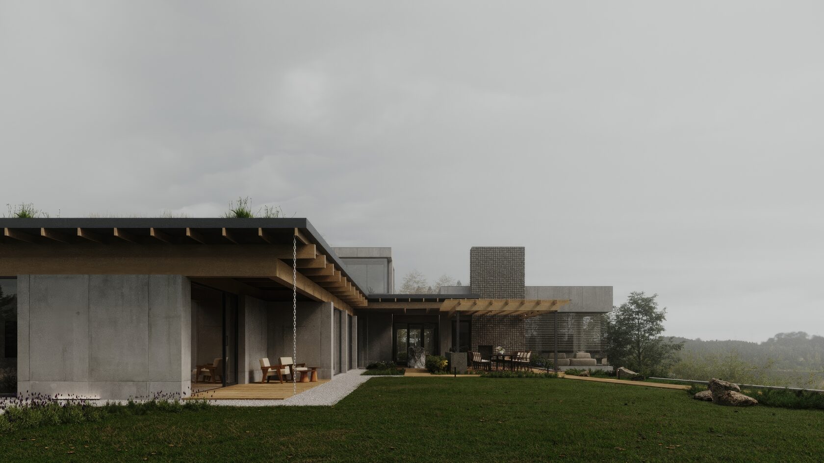 Пространство открыто для природы благодаря панорамному остеклению и террасам, обеспечивающим гармонию с окружающим ландшафтом. Текстура и геометрия фасада подчеркивают современный подход, сочетая функциональность с созерцательным комфортом.