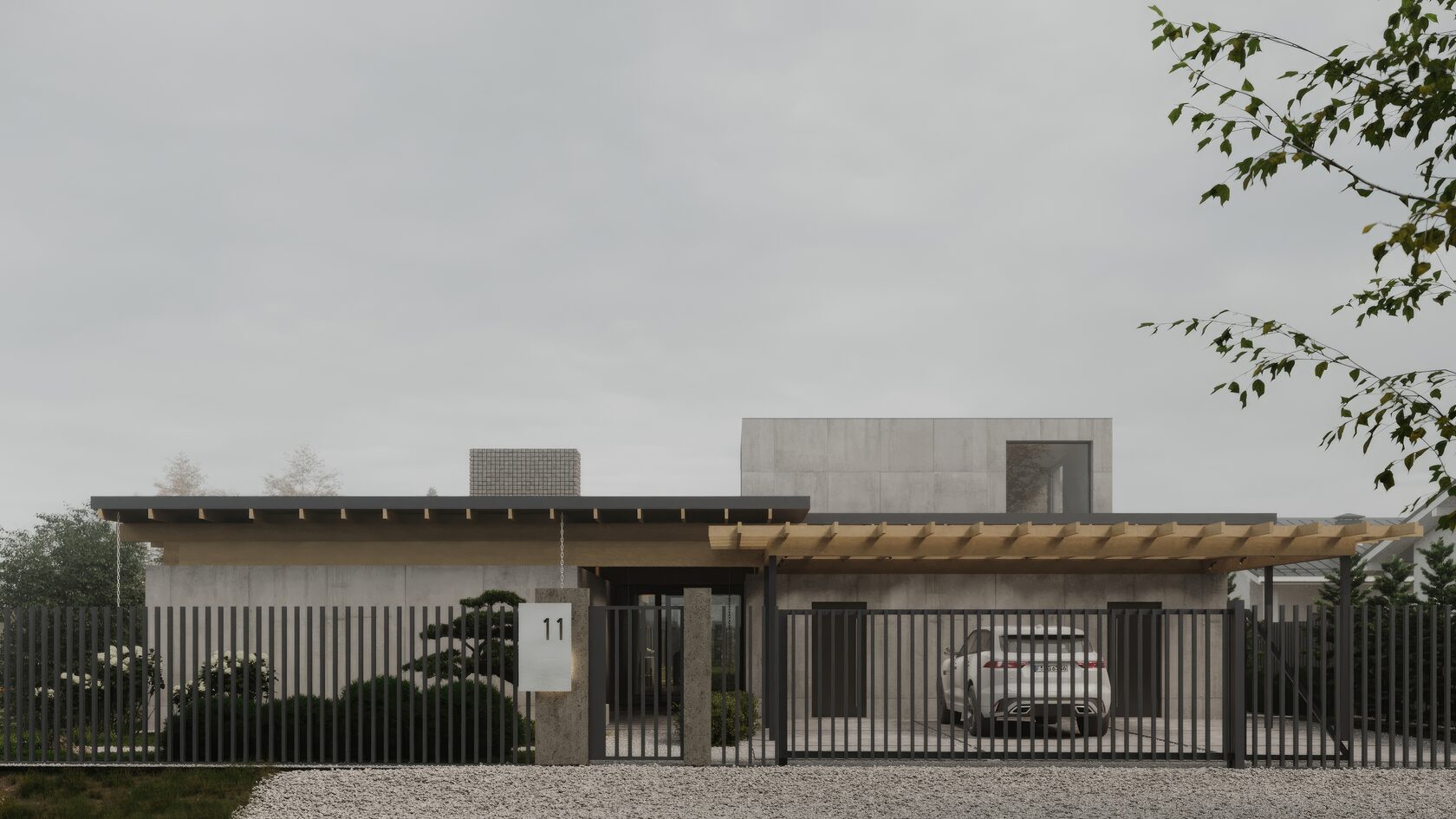 Изящная лестница, ведущая к главному входу, добавляет динамики, подчеркивая открытость пространства. Каждый элемент, от текстур до геометрии, работает на уют и функциональность, делая дом идеальным для спокойного отдыха.