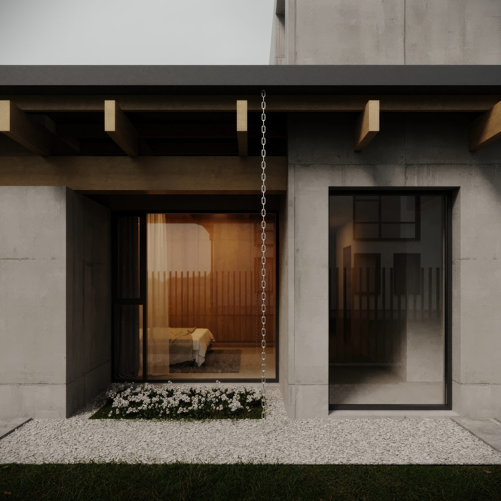 Асимметричная композиция фасада с крупными стеклянными проемами создает динамичный ритм, подчеркивая связь с природным окружением. Стилистика проекта направлена на создание лаконичного, но выразительного пространства, обеспечивающего баланс между функциональностью и эстетической глубиной.