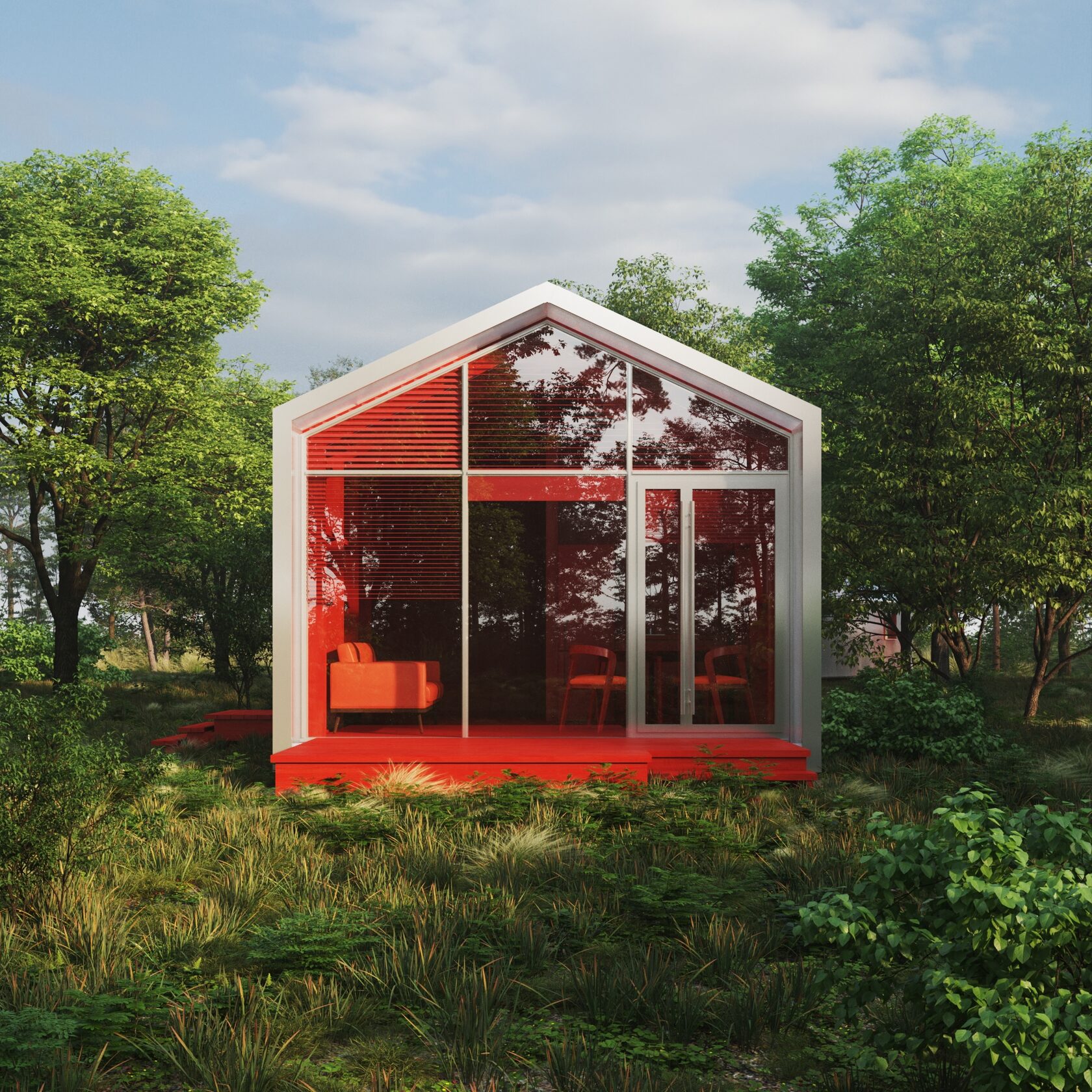 Компактная конструкция в современном минималистичном стиле, где сочетание полупрозрачных панелей и панорамного остекления создает ощущение легкости и открытости пространства. Яркие красные акценты на террасе и оконных рамах добавляют динамики, подчеркивая связь с природным окружением.