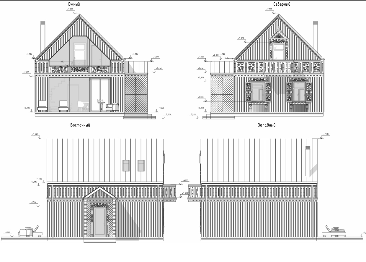 Внутри дома словно сохранилось тепло старых историй и мечты о простом счастье. Каждая деталь, от деревянной резьбы до изогнутых скатов крыши, продумана так, чтобы соединить традиции и современные строительные стандарты. Безрамное остекление на балконе аккуратно встроено в архитектуру, чтобы не нарушать цельность силуэта и сохранить чистоту линий.