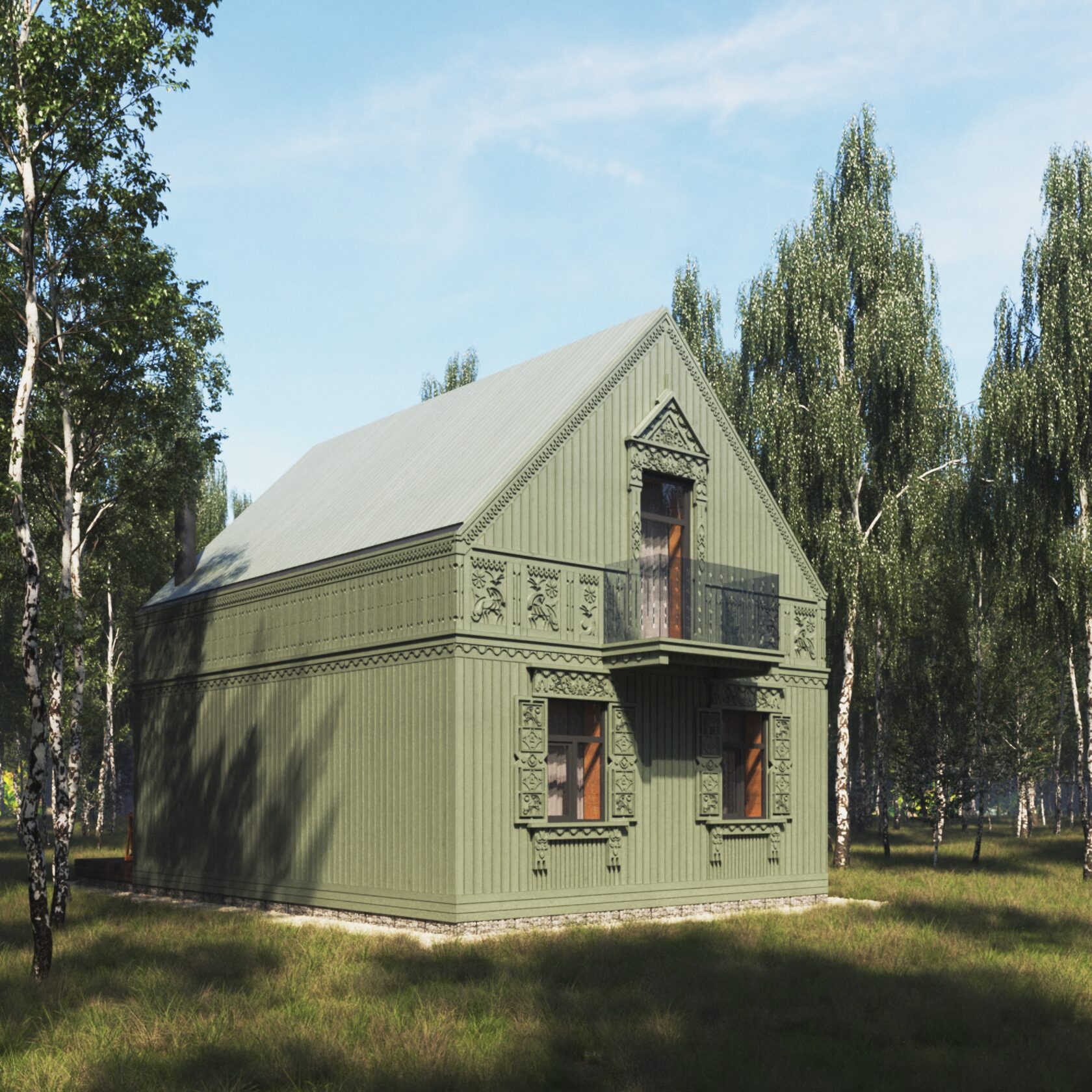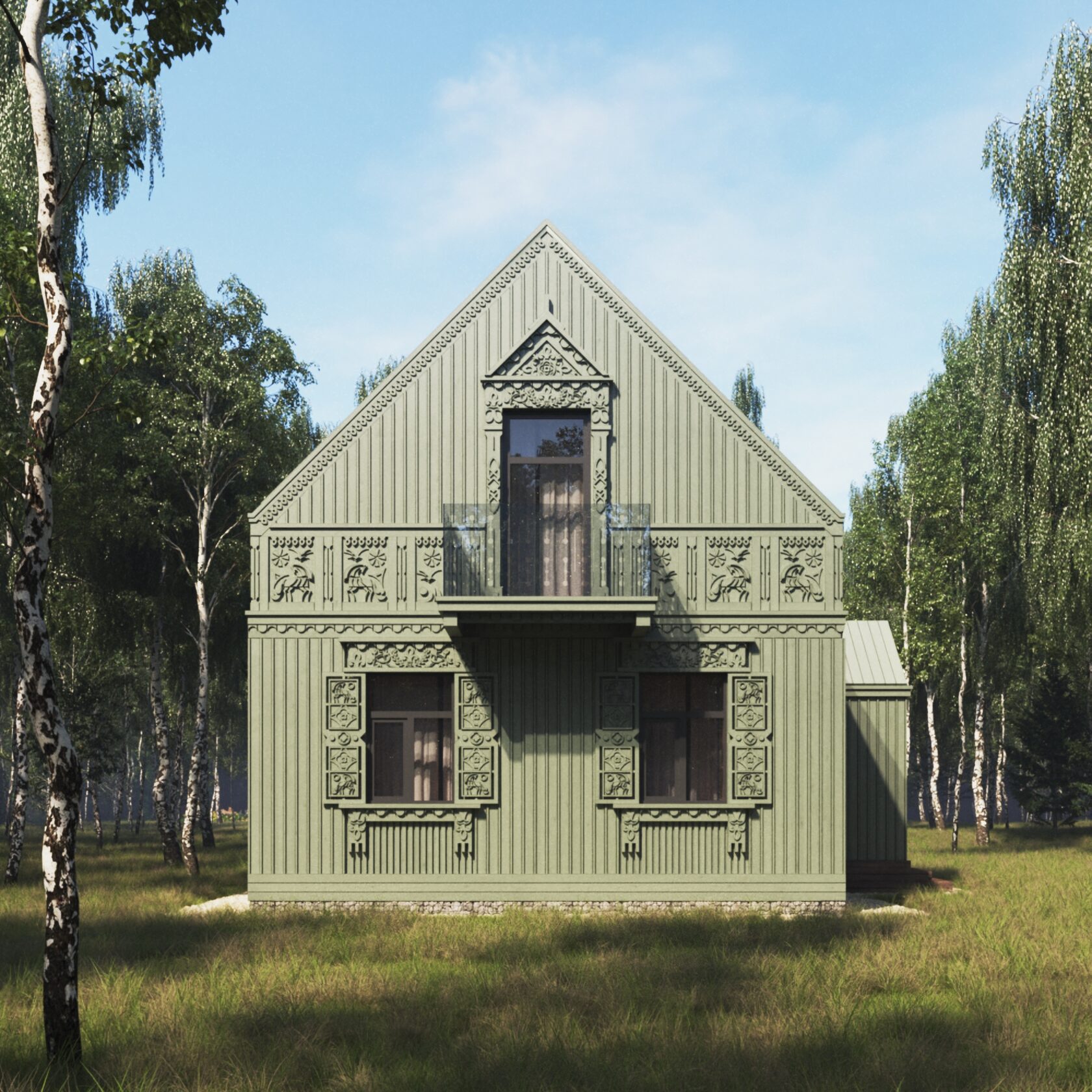 Дом, окружённый густым лесом, словно пряничный домик из сказки, где архитектура оживает в гармонии с природой. Резные наличники на окнах подчёркивают сказочный стиль, наполняя фасад деталями, вдохновлёнными народными мотивами. Светлое дерево, мягкие линии и заботливо выверенные пропорции создают ощущение уюта и защищённости.