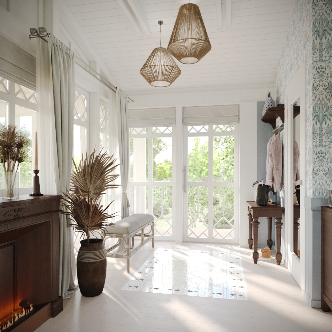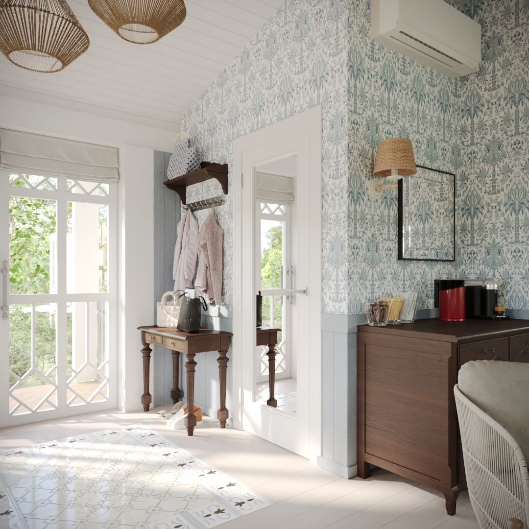 Современная интерпретация классических мотивов с акцентом на уют и индивидуальность: резные деревянные детали, текстиль с кружевами, флористические обои, натуральные материалы.
