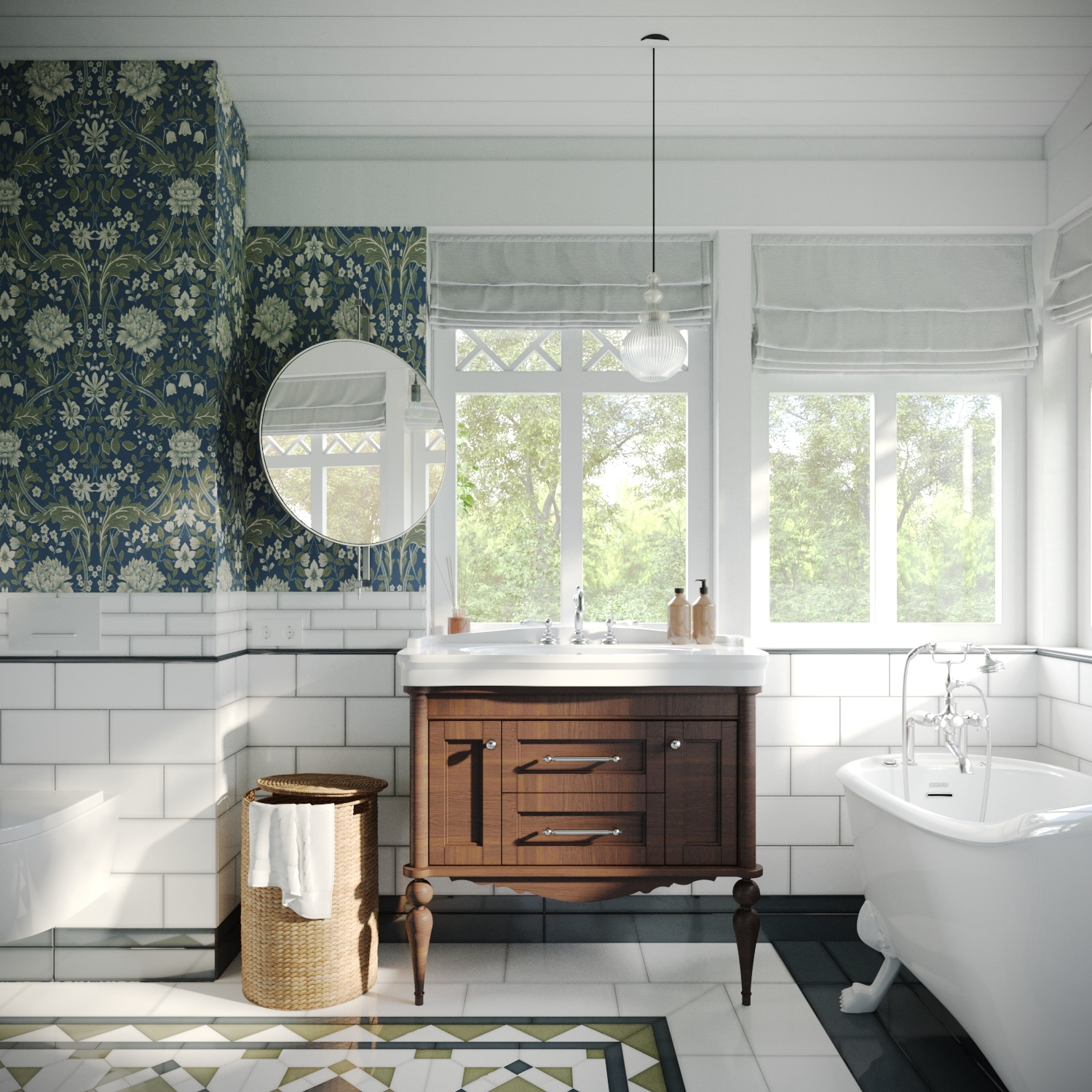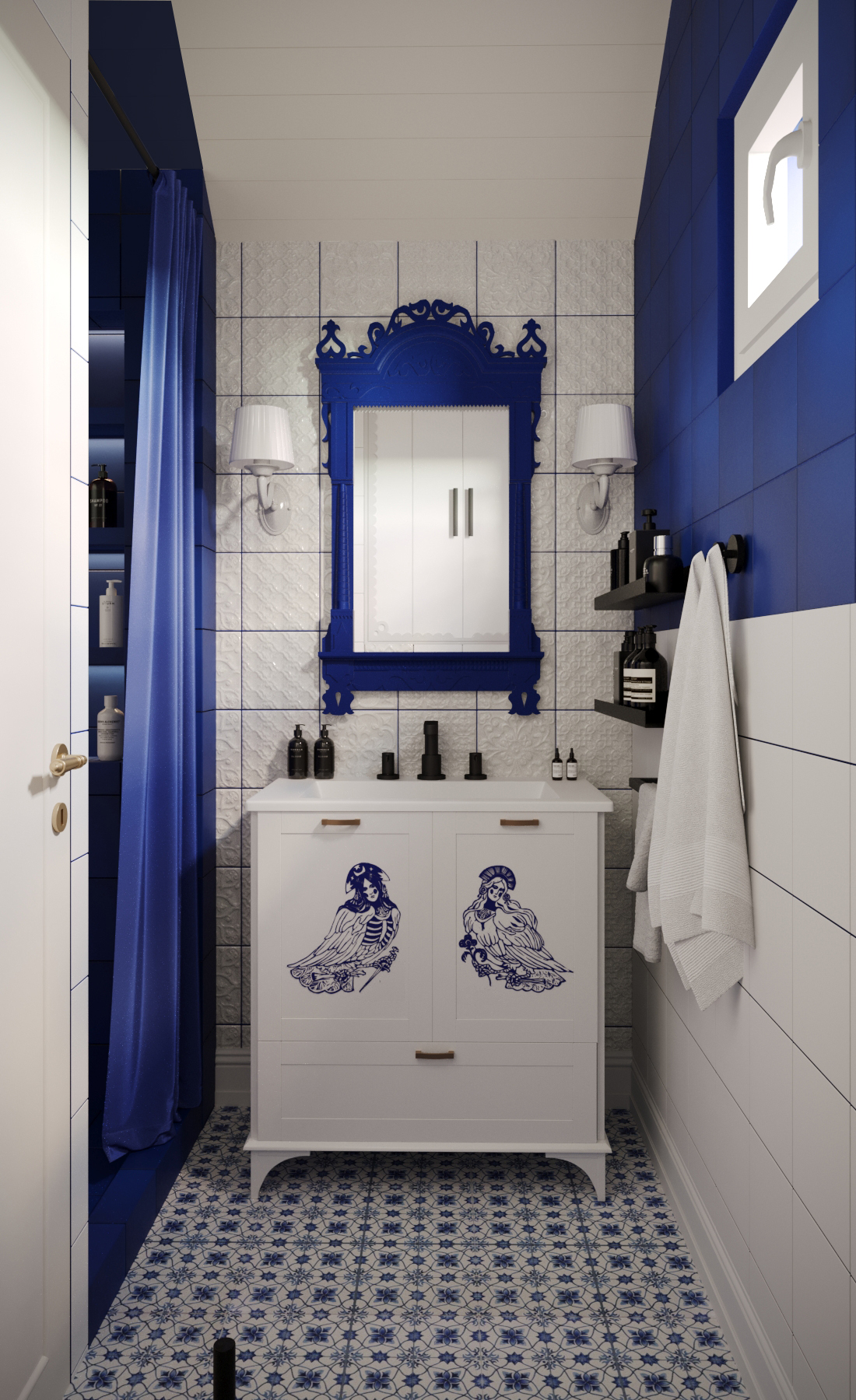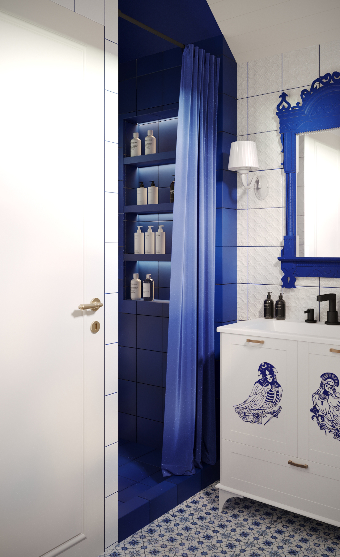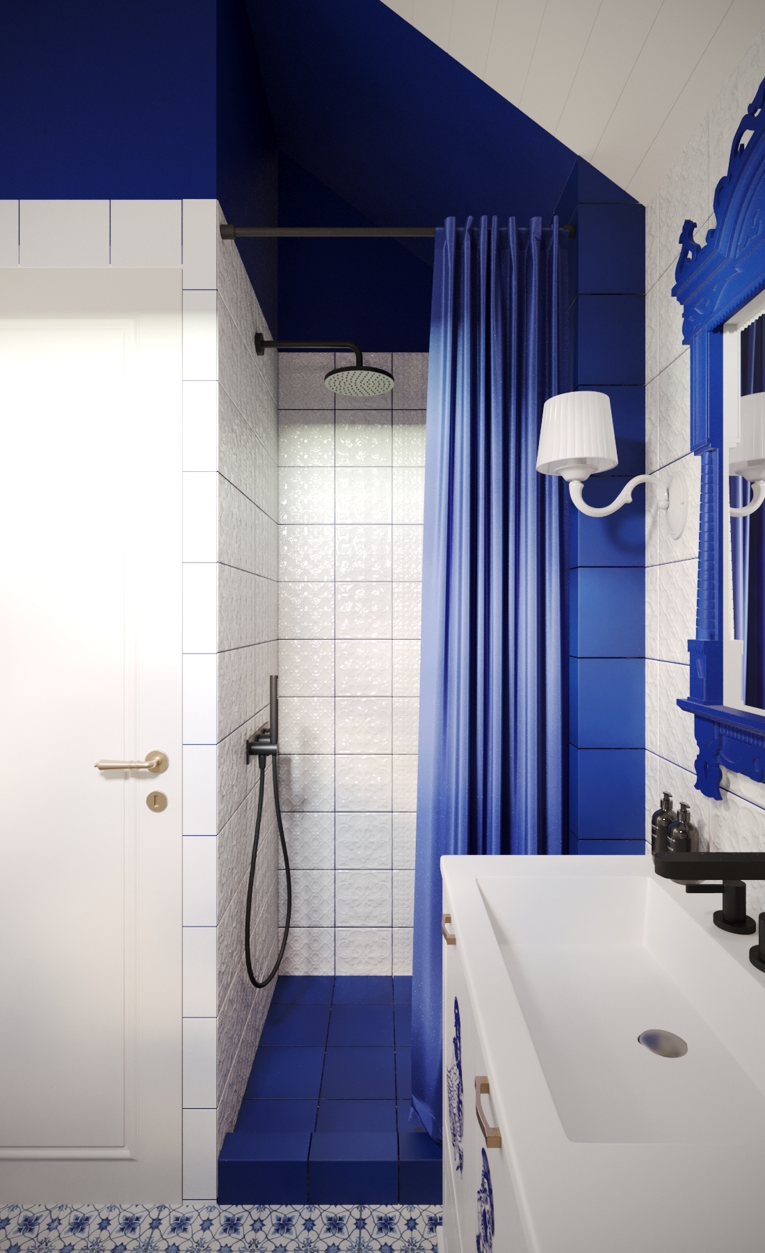 Санузел, оформленный под гжель с использованием плитки "Синий русский" от "ВЕРА", продолжает заданный мотив, но уже в яркой и контрастной интерпретации.