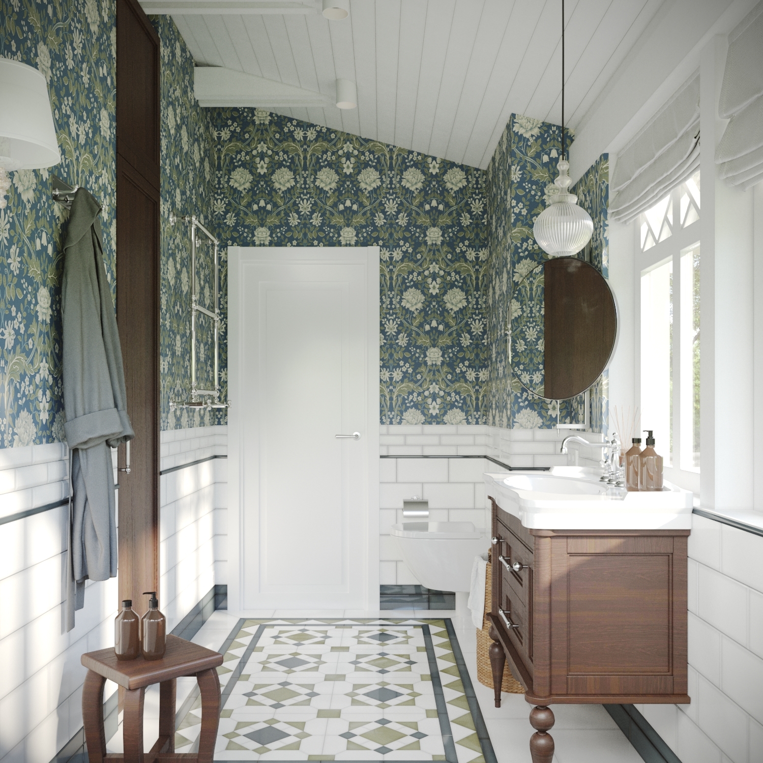 Резная деревянная кровать и обои с цветочным орнаментом напоминают старинную расписную шкатулку, передаваемую из поколения в поколение как драгоценную семейную реликвию.